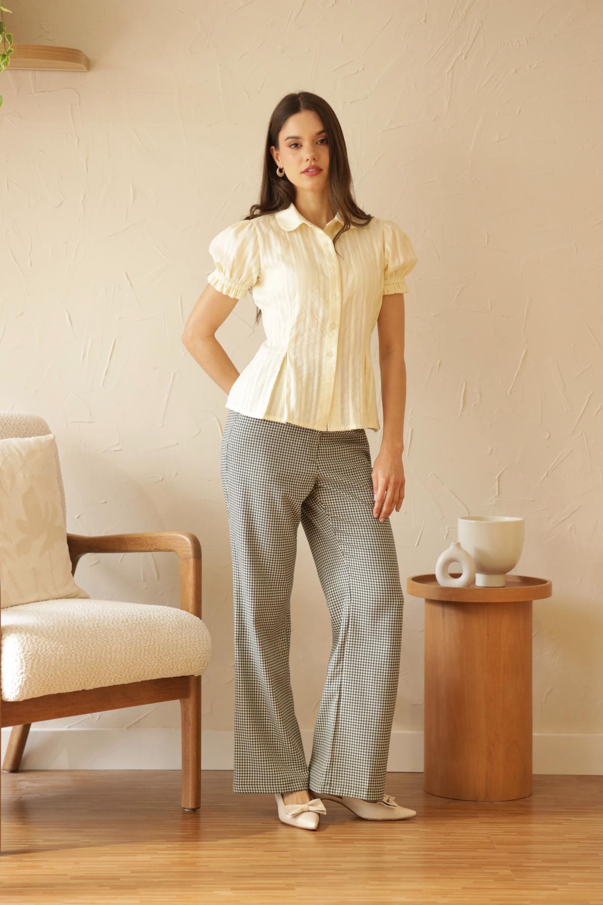 Blusa de mangas pequeñas con detalle fruncido y delicados pliegues encontrados en la zona inferior que crean un efecto peplum sutil, encuéntrala en dos tonos muy versátiles, azul marino para resaltar y vainilla para aportar un poco de color