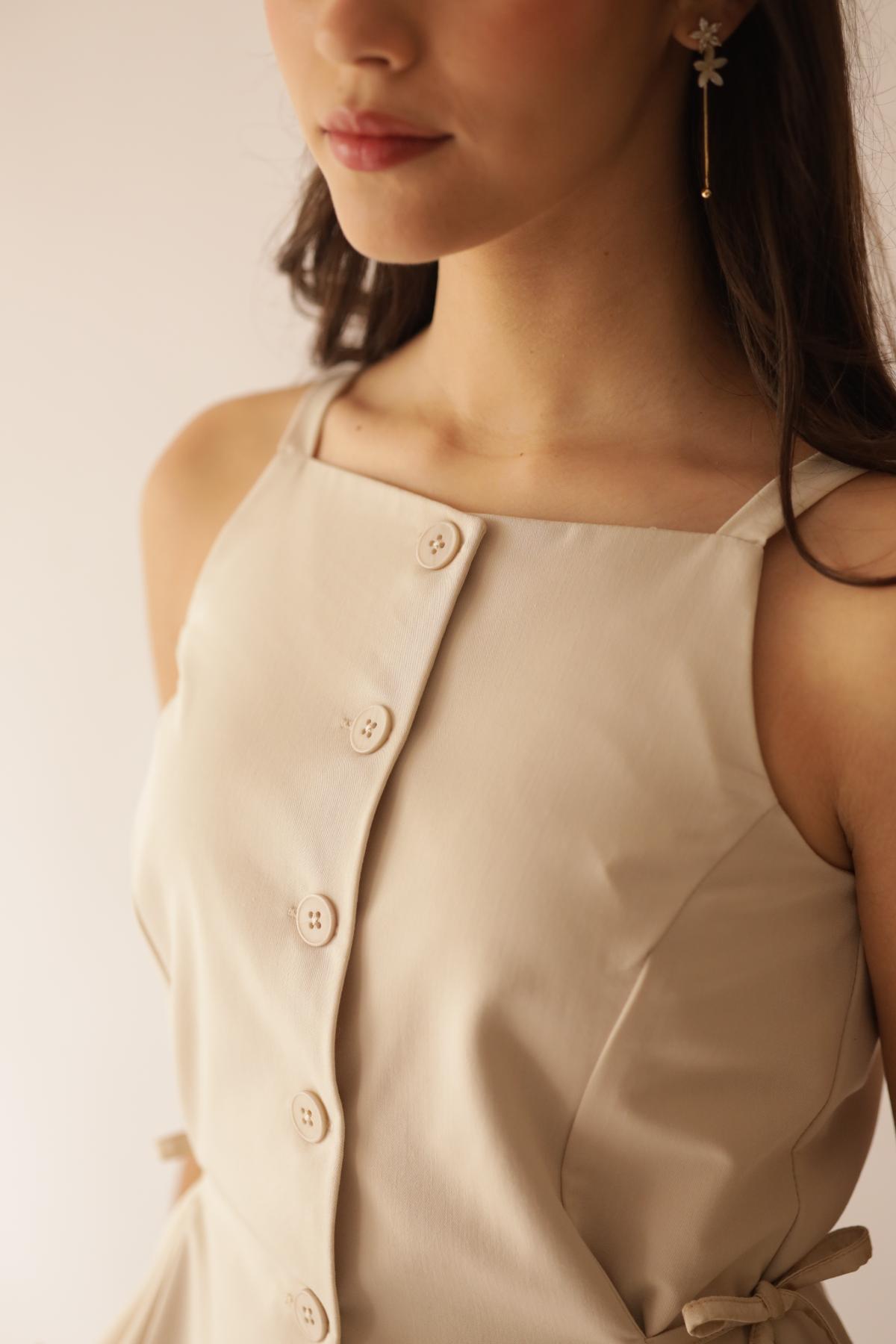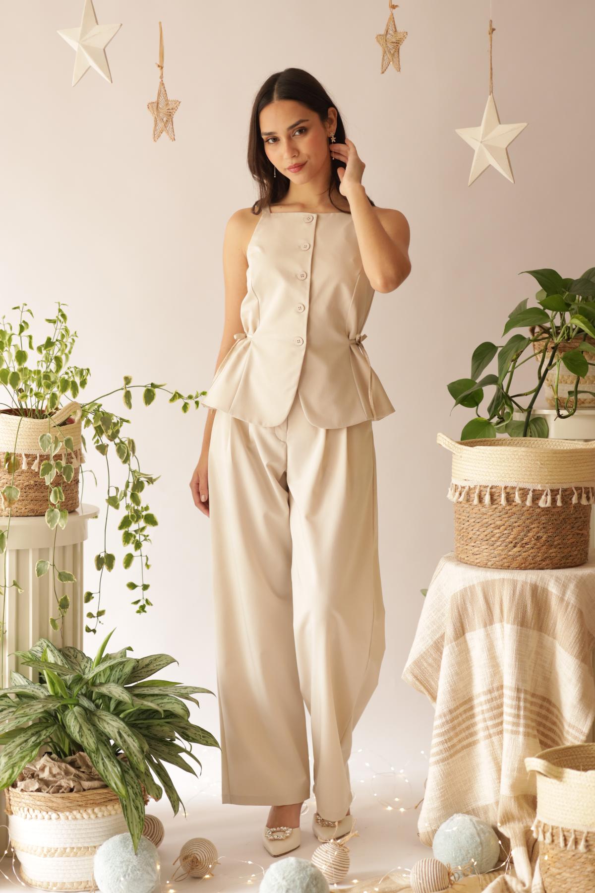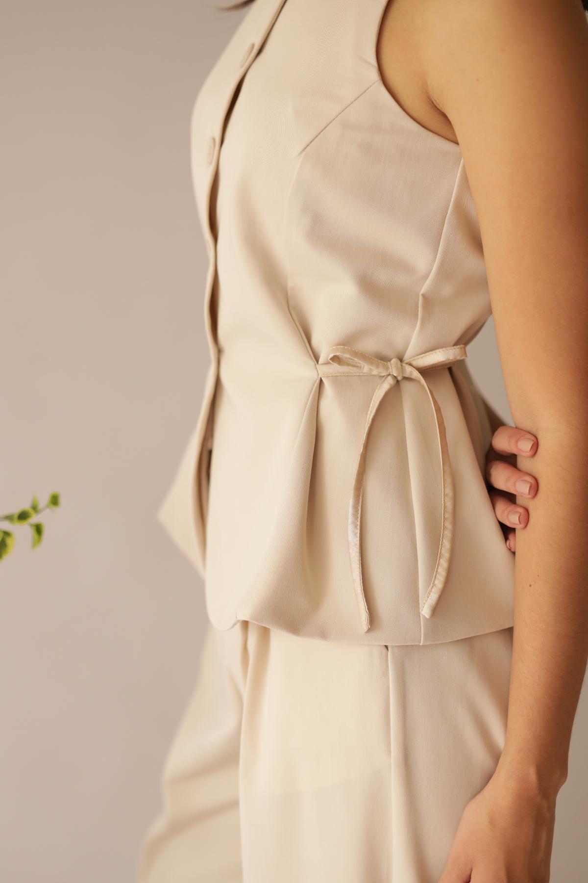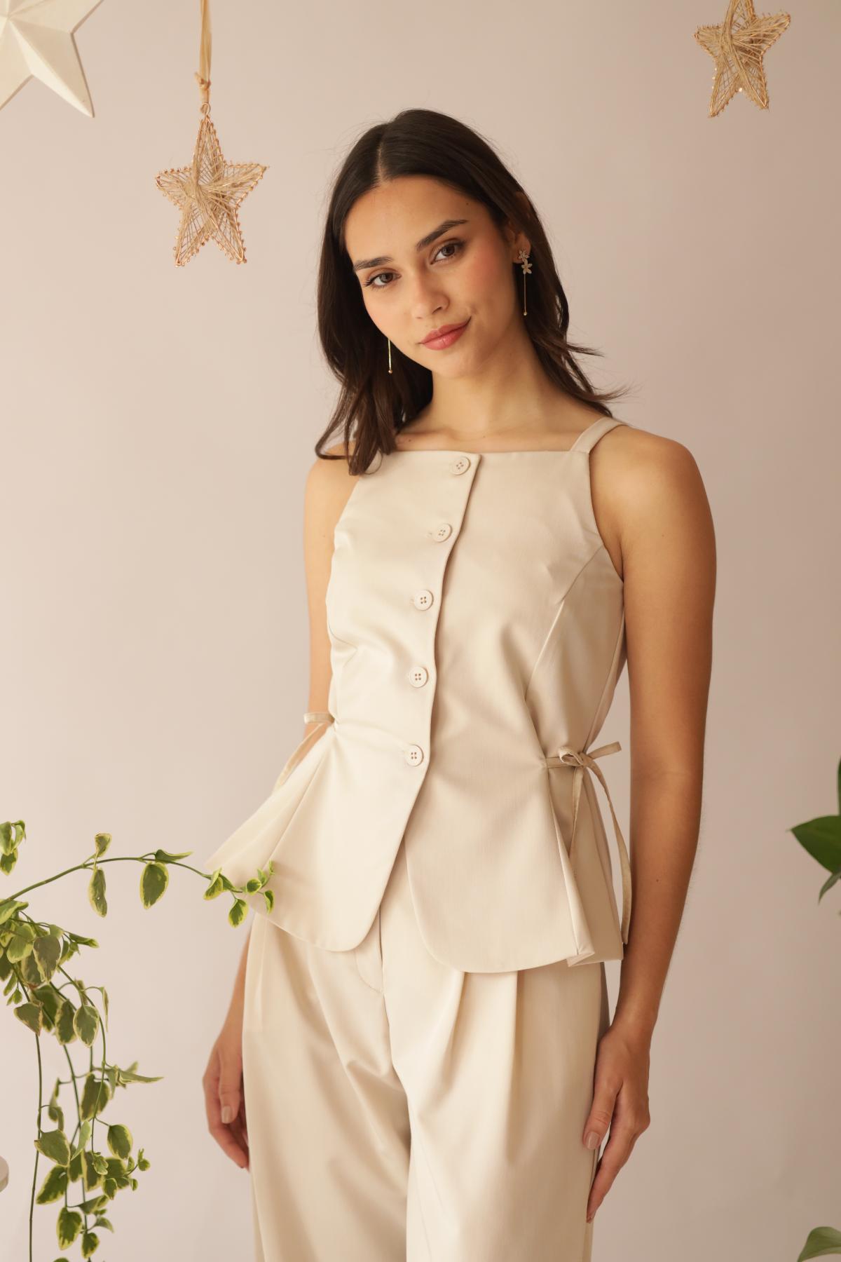 Chaleco con escote recto y tiras en la zona de hombro. Cuenta con cortes en la zona delantera y posterior y los que se ubica un lazo en satin que aporta el toque romántico en la pieza y permite ceñir a medida en cintura, creando un efecto peplum muy favorecedor