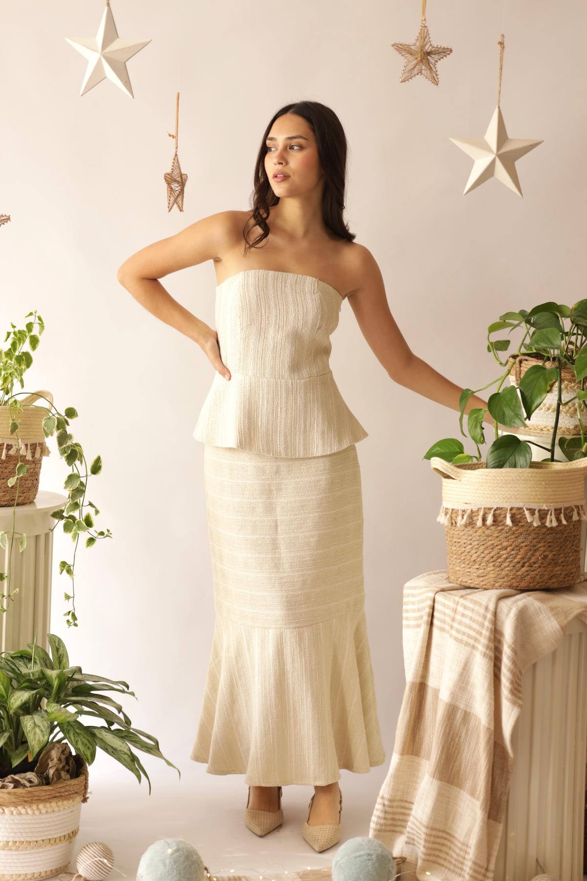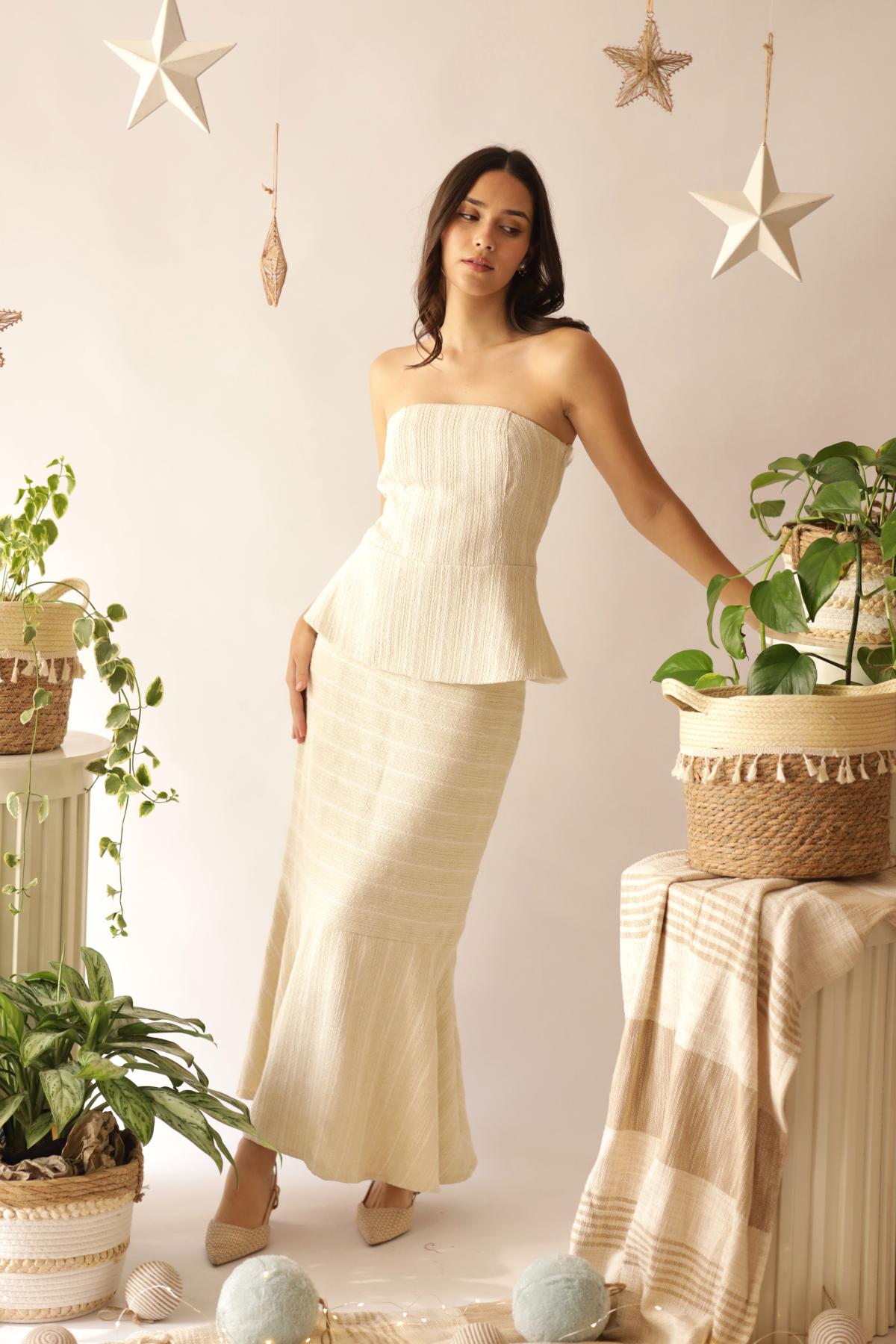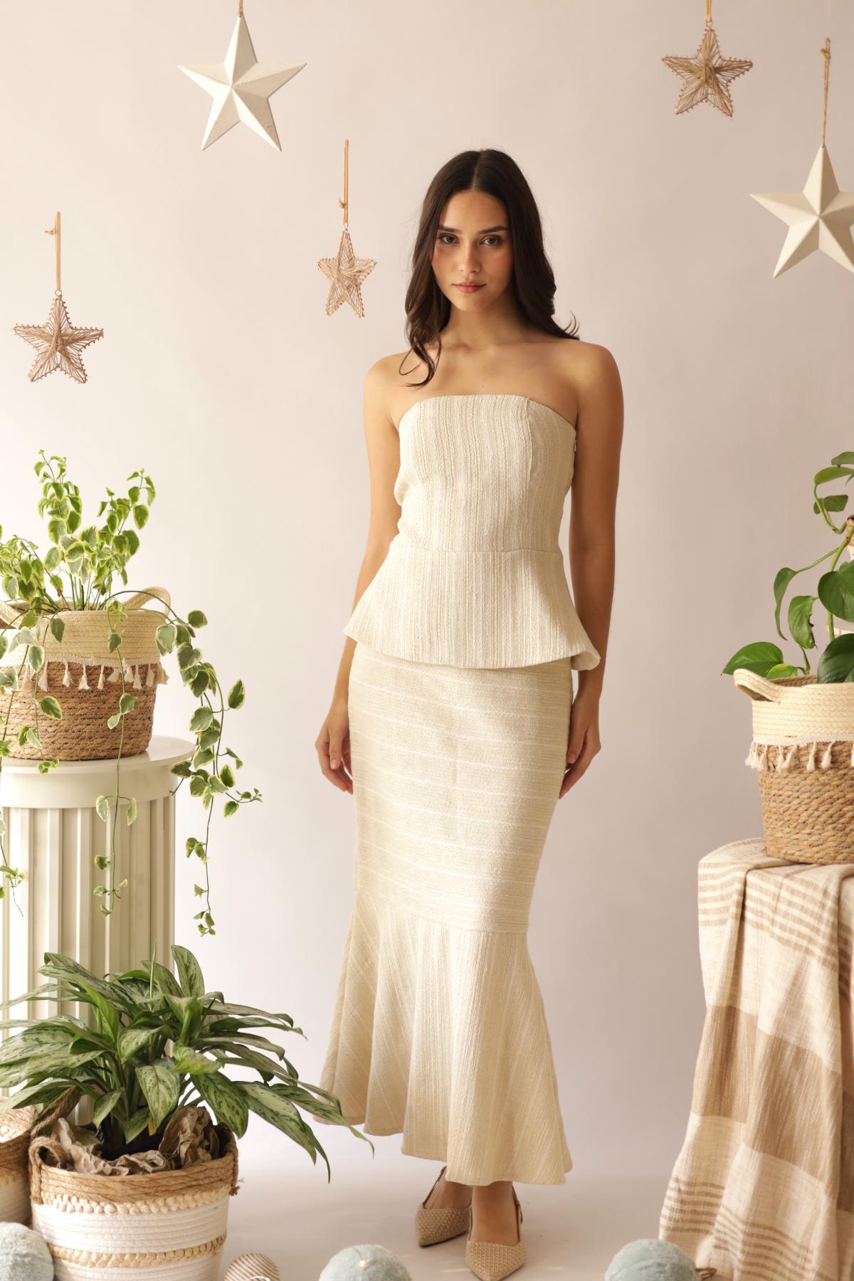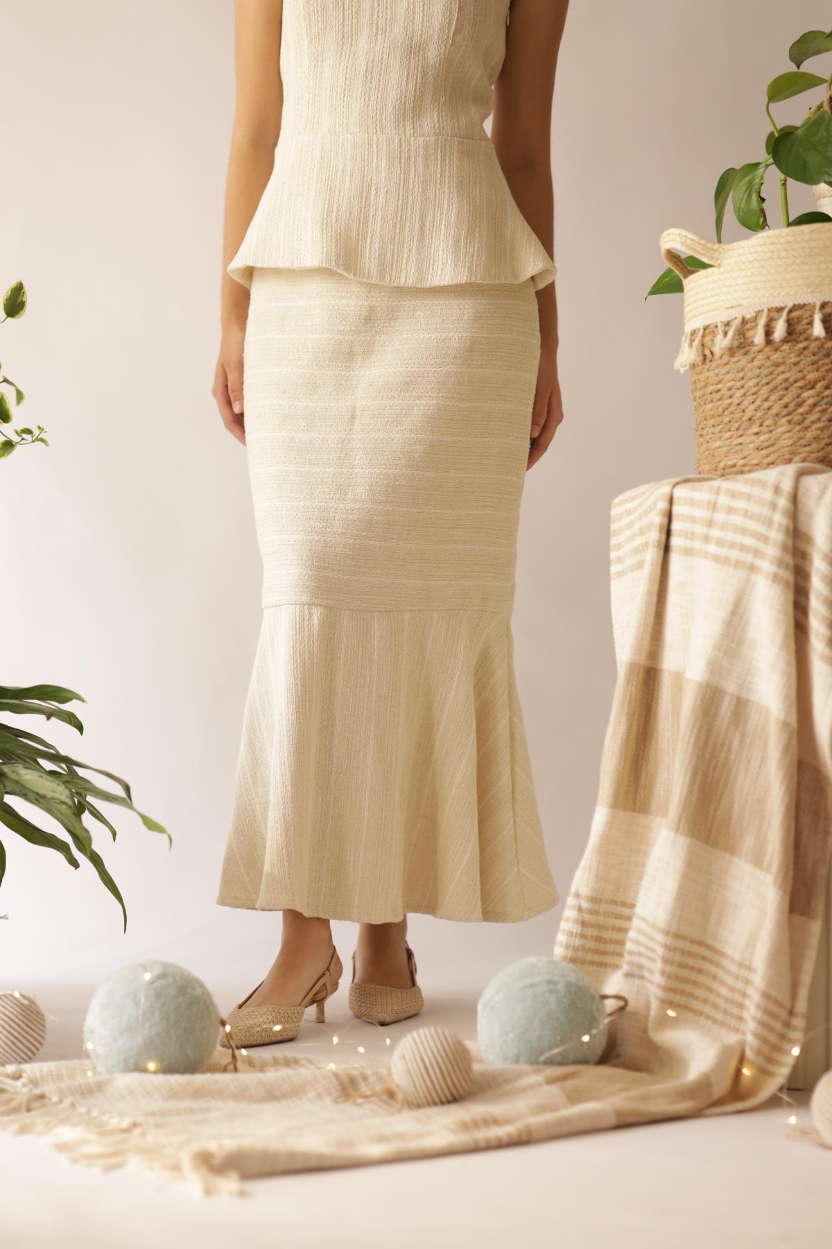 La falda que no sabías que necesitabas, con delicados hilos dorados su textura y brillo aportará el realce que tú look necesita, falda tipo sirena con detalle de volante en ruedo de falda, será la pieza que sin duda robará miradas , perfecta para tus eventos de fin de año o para looks más casuales pero chic.