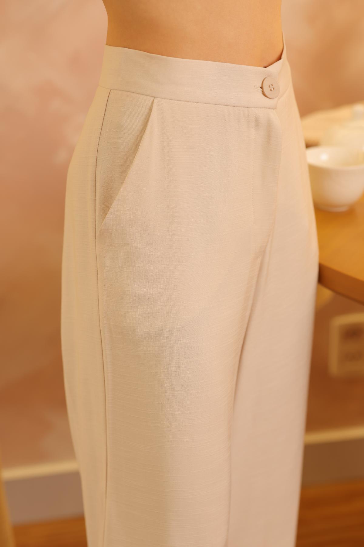 Pantalón de tiro alto con caída suave y silueta relajada. Destaca por un aplique tipo bolillo en la basta que aporta un detalle especial sin perder ligereza. Un básico con encanto, ideal para elevar cualquier look veraniego.