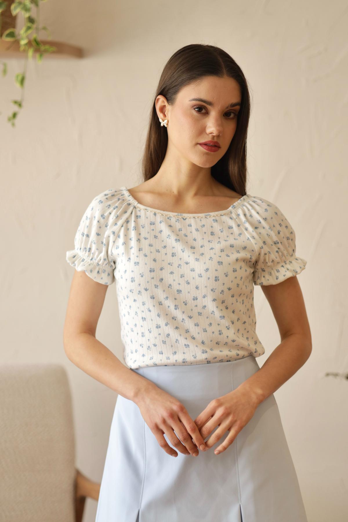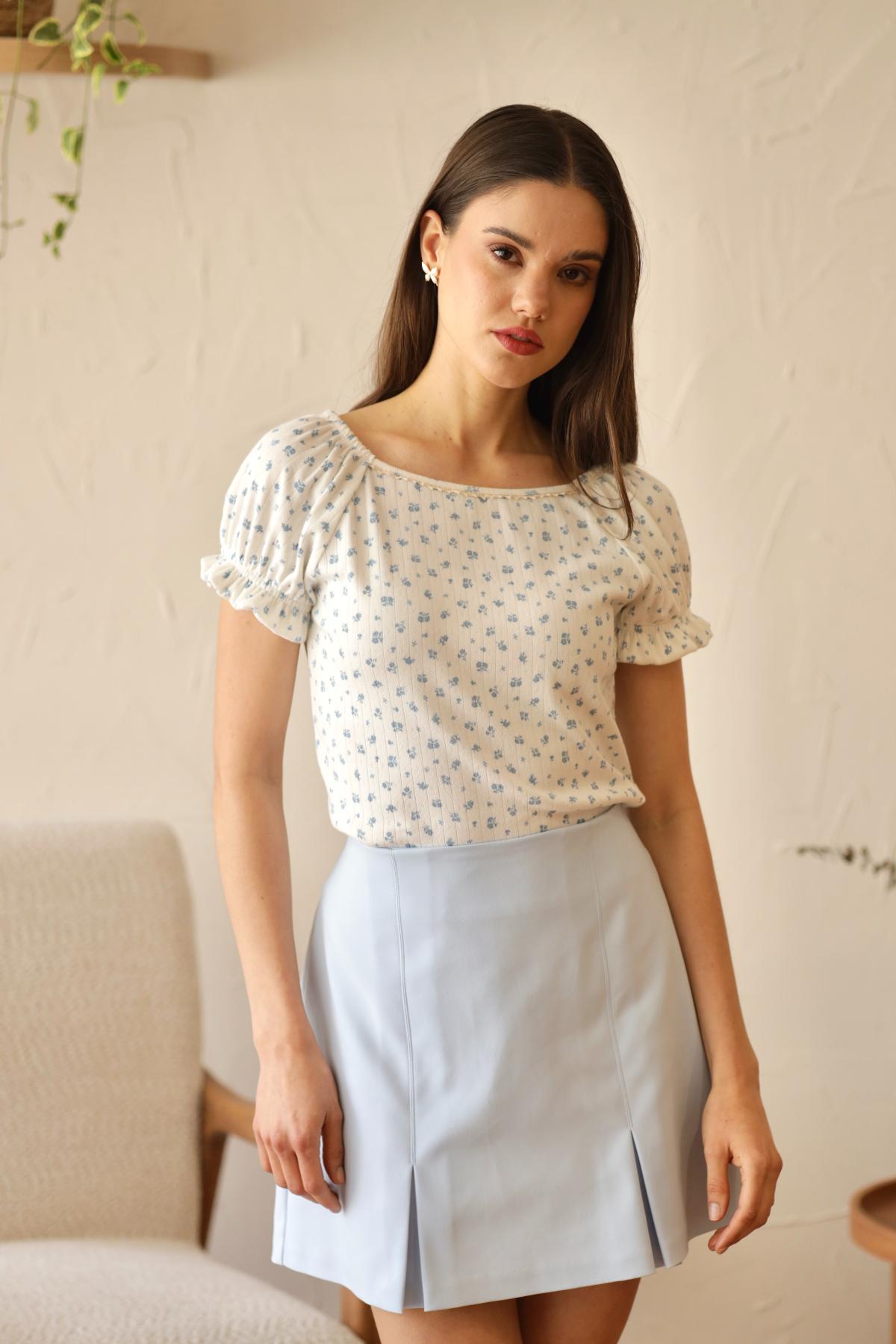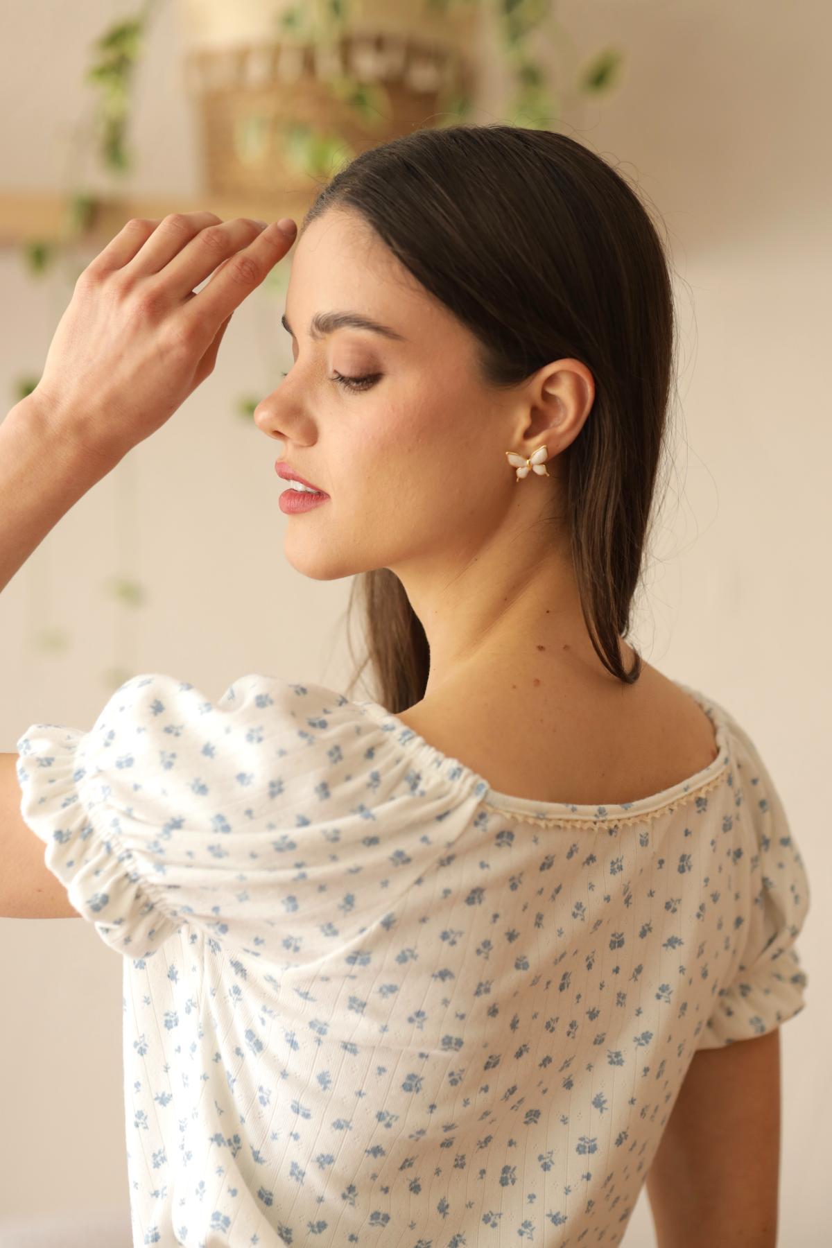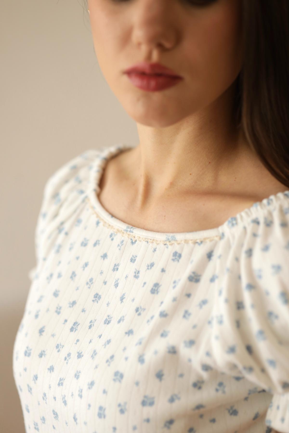 Top sencillo y romántico, de tela tipo chompera, con textura suave y comoda. Presenta un delicado detalle de bolillo en el cuello, que aporta un toque femenino y sutil además de pequeñas manguitas abullonadas. Una pieza para el día a día, versátil y linda en cualquier clóset.