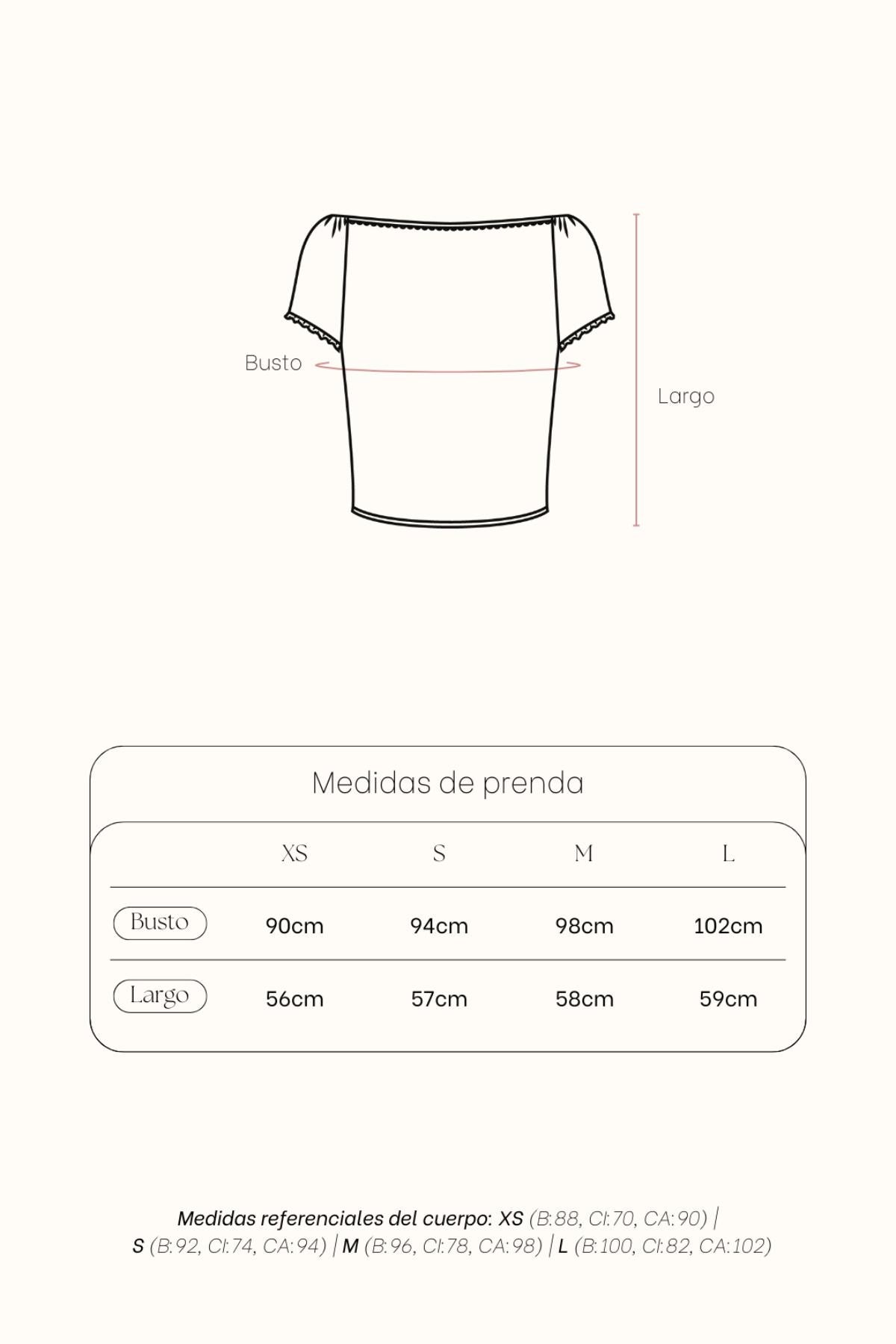 INFORMACIÓN: Modelo usa talla Xs, medidas de Brenda: Busto (76cm) Cintura (65cm) Cadera (89cm) Altura (1.68cm)